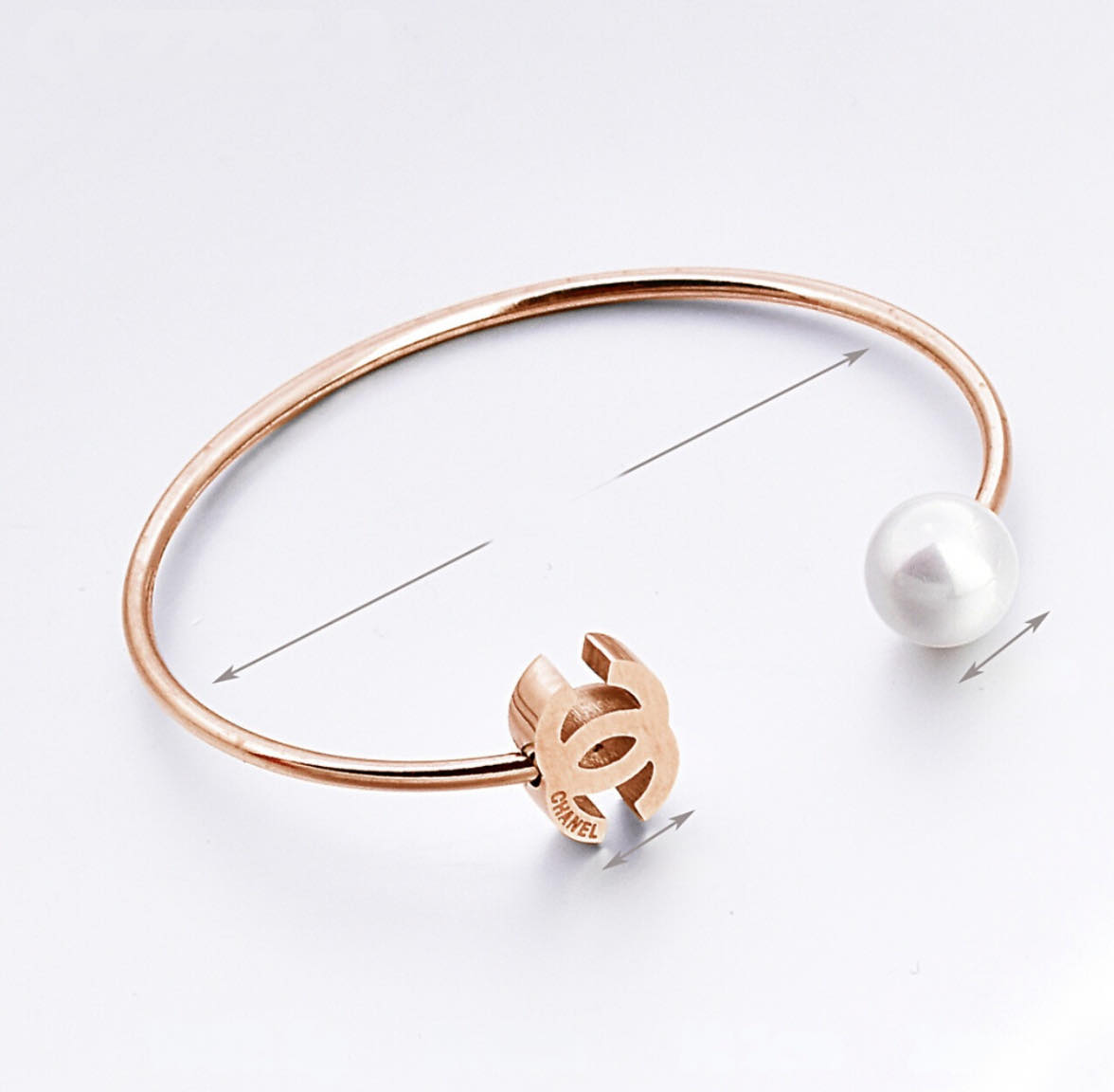 Bratara fixa roze din titan placata cu aur de 18k,decorata cu logo-ul Chanel si o perla alba la capat.Design simplu si elegant.