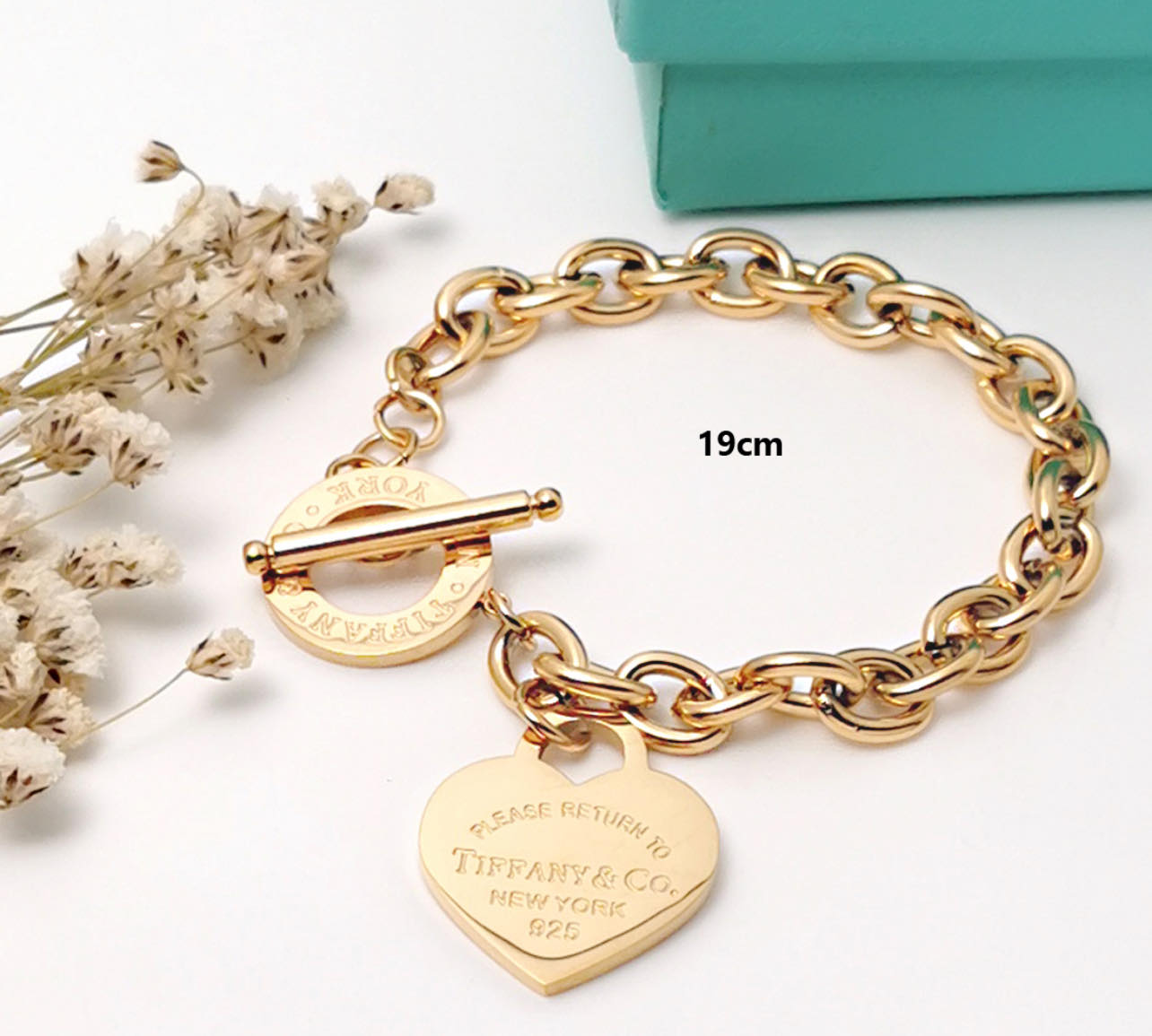 Bratara placata cu aur,de 19cm,din gama Tiffany&Co.,cu lantisor grossi pandativ in forma de inima inscriptionat cu logo „PLEASE RETURN TO TIFFNY&CO.NEW YORK 925