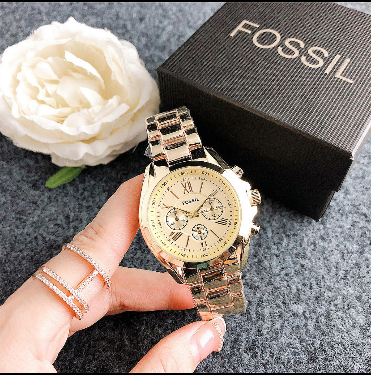 Ceas tip Fossil cu design elegant,in nuante aurii.Ceasul are un cadran detaliat,cu trei subcadrane pentru functii cronograf si indicatoare orare romane. Acest model combina functionalitatea cu un aspect sofisticat.