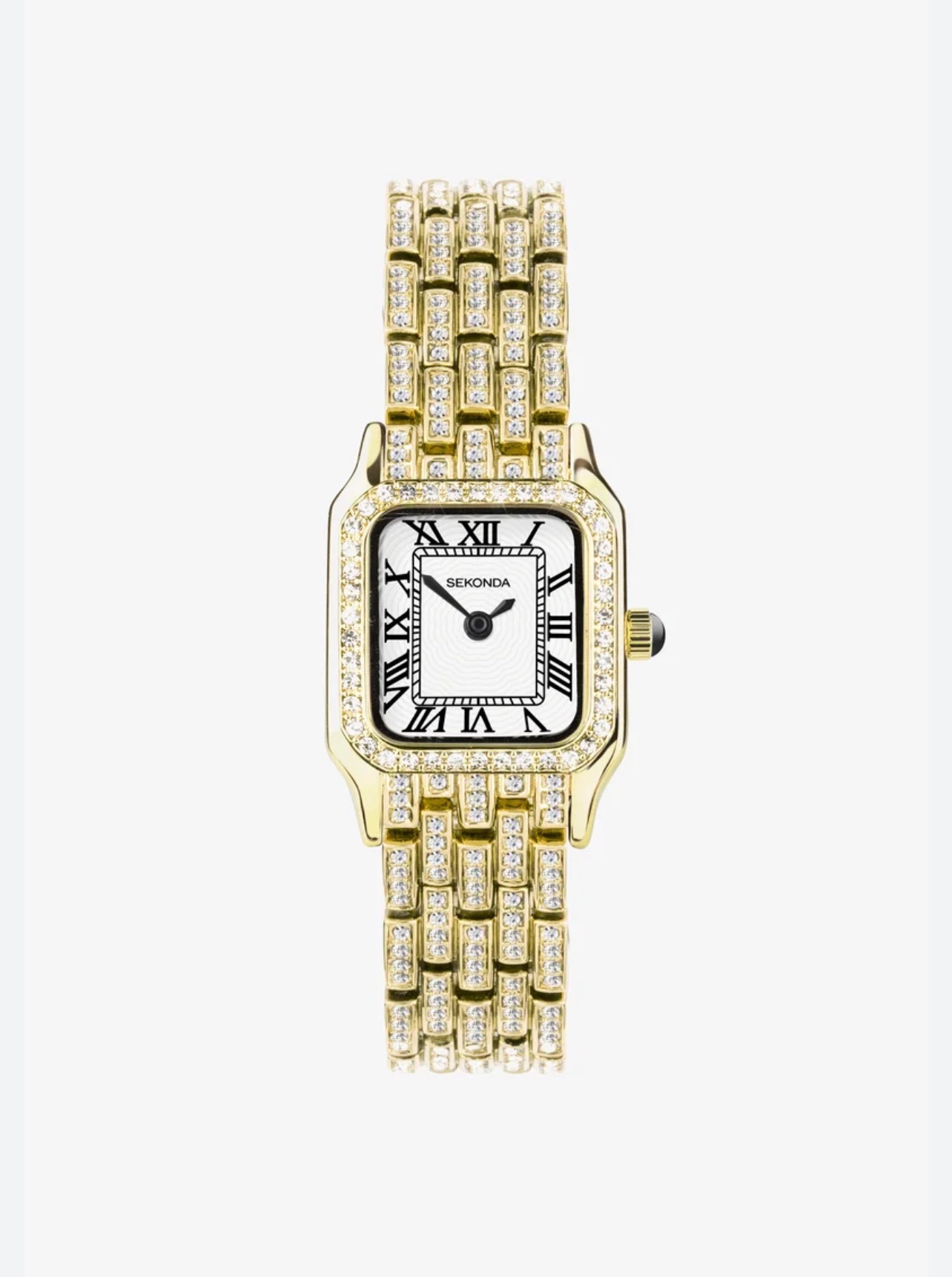 Ceas aurit cu cadran patrat si cifre romane,inspirat de stilul clasic al ceasurilor de lux.