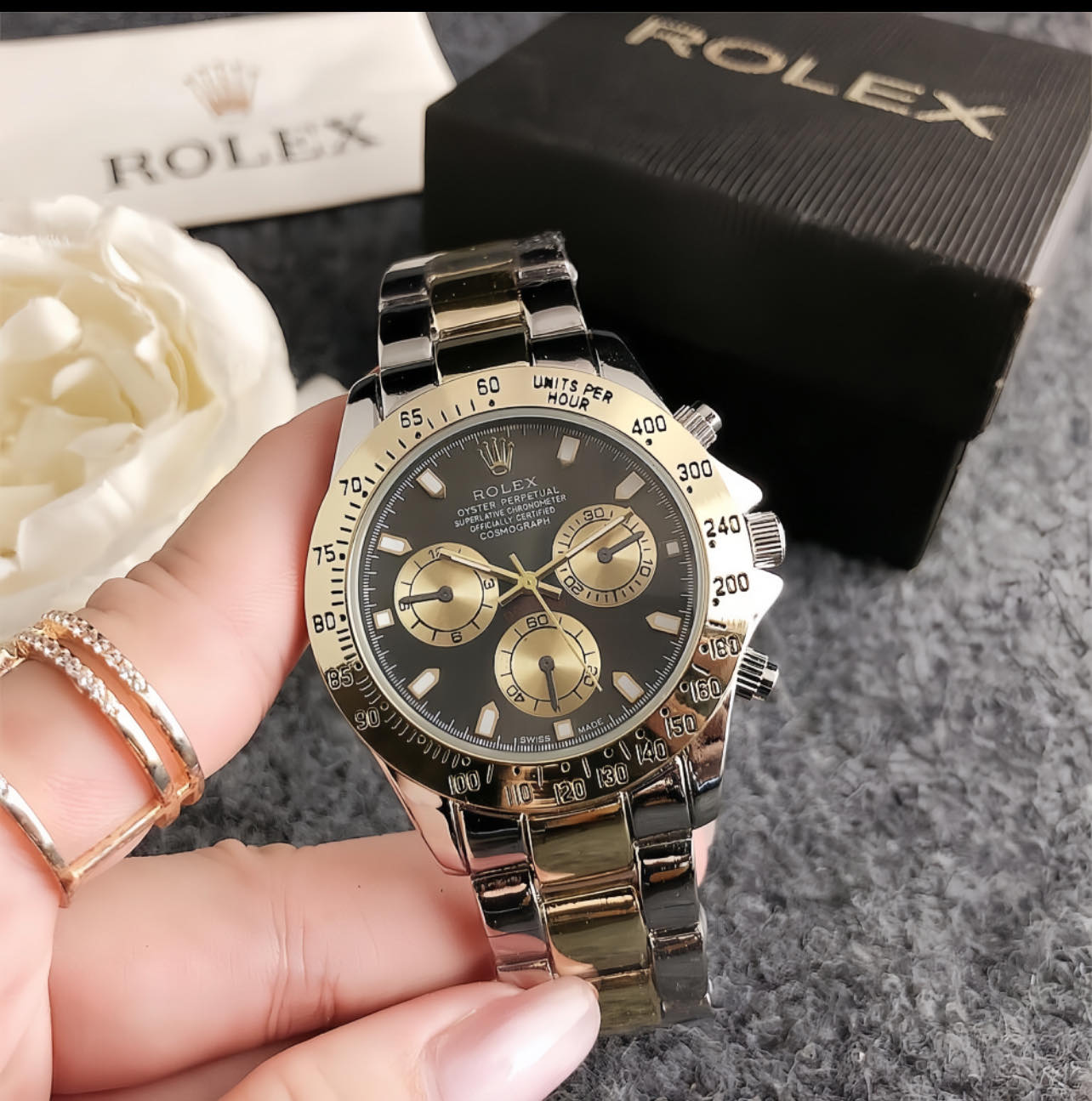 Ceas tip Rolex cronograf,bratara metalica bicolora si un cadran negru. Ceasul are trei subcadrane aurii si inscriptiile „ROLEX” si „OYSTER PERPETUAL”vizibile pe fata acestuia.
