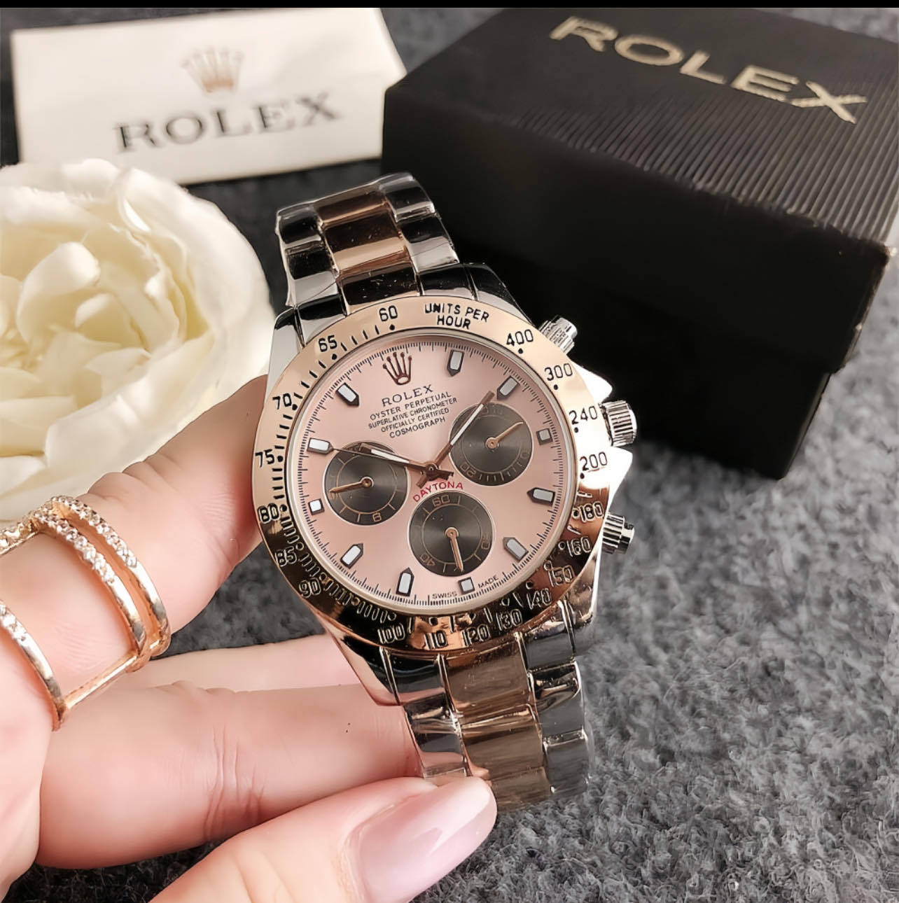 Ceas tip Rolex cronograf,bratara metalica bicolora si cadran roze cu negru.