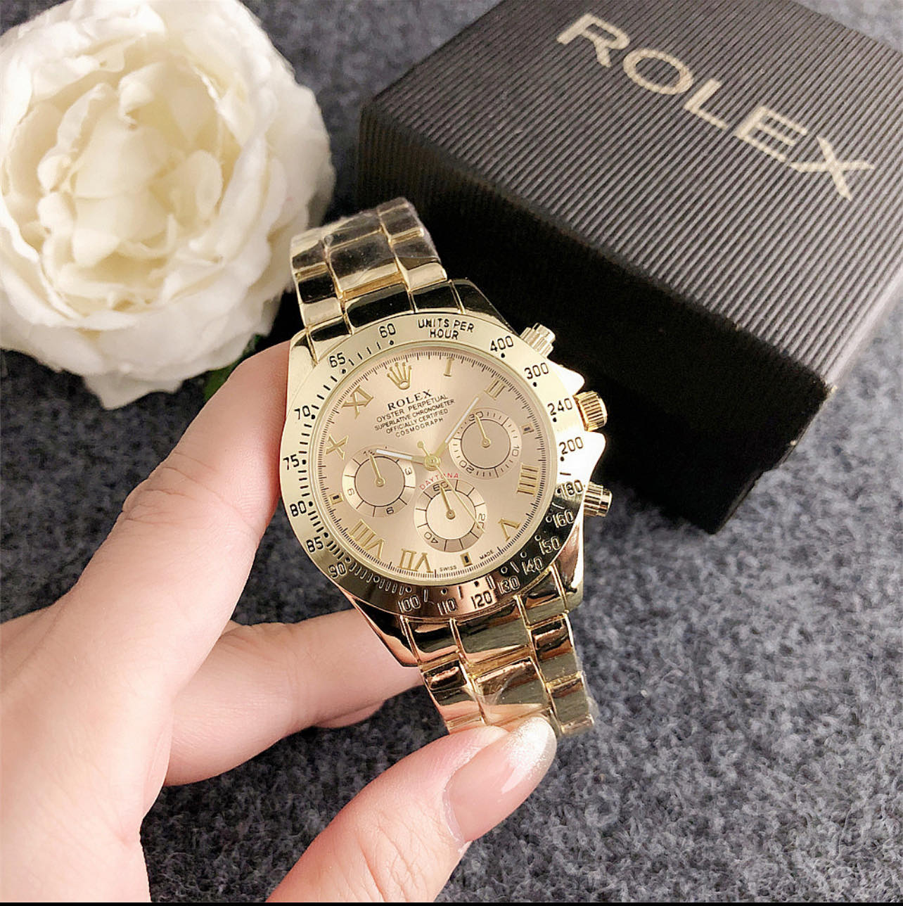 Ceas tip Rolex cu functie cronograf. Ceasul are o bratara aurie,un cadran auriu asortat si marcaje cu cifre romane.
