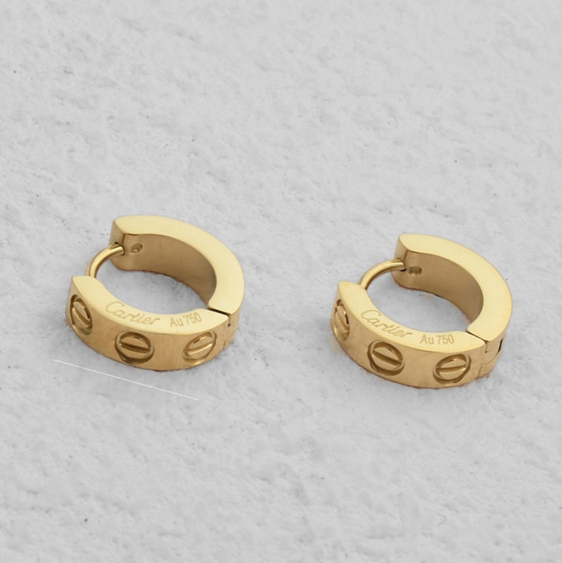 Cercei realizati din titan si placati cu aur de 18k,design simplu dar elegant,tip cercel huggie cu elemente caracteristice colectiei Love de la Cartier. Designul lor clasic si atemporal ii face potriviti pentru diverse ocazii.