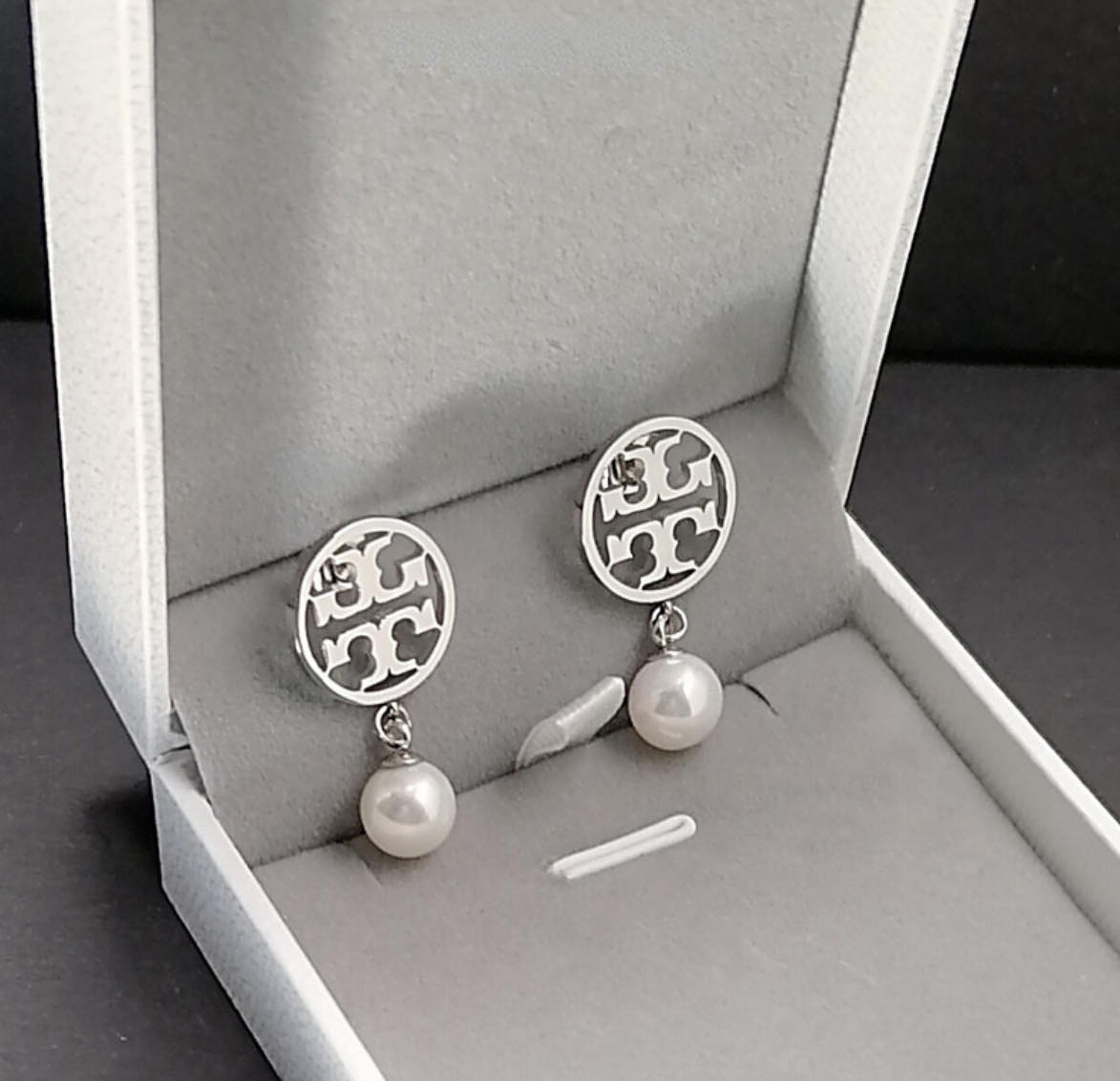 Cerceii sunt tip Tory Burch,confectionati din titan,cu un design distinctiv ce include un disc decorativ si o perla alba atarnand dedesubt.