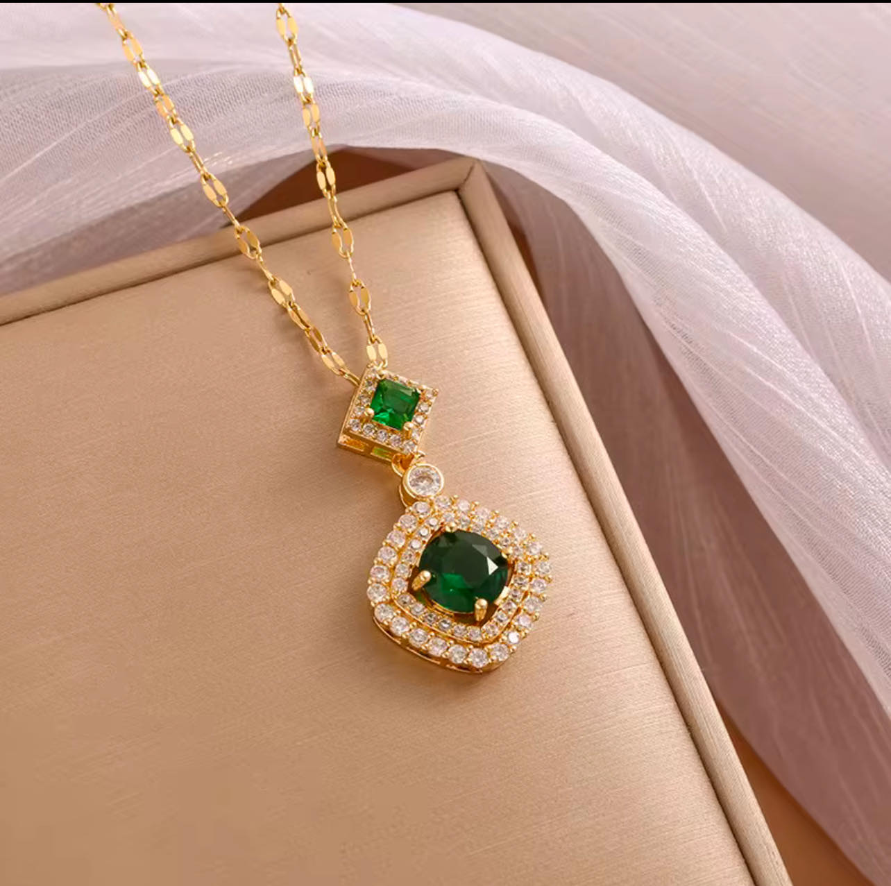 Colier elegant placat cu aur 18k,cu pandativ decorat cu un cristal verde vibrant si detalii stralucitoare.Perfect pentru ocazii speciale.
