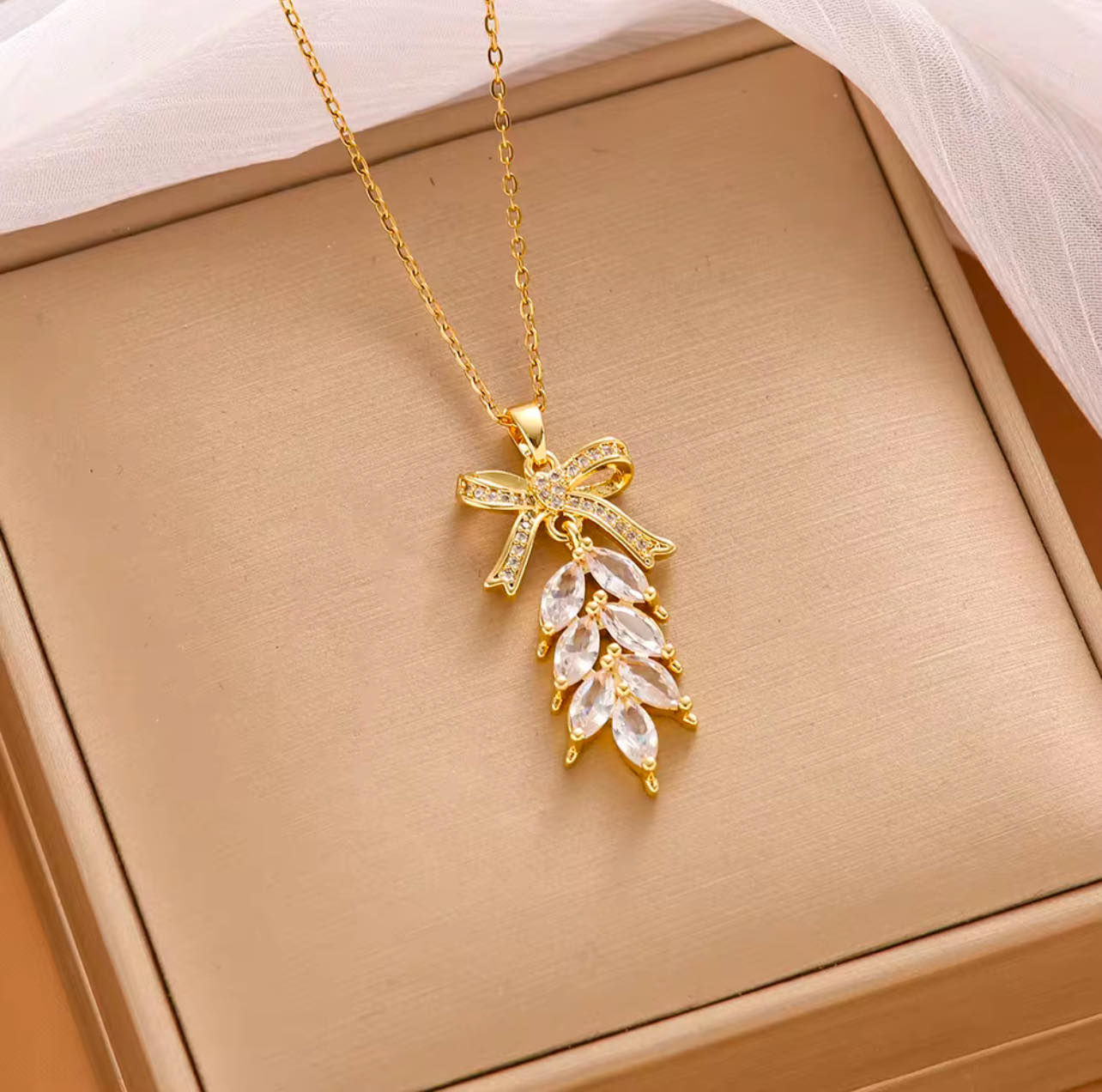 Colier delicat placat cu aur 18k,cu pandativ in forma de fundita si cristale elegante.Un accesoriu rafinat pentru ocazii speciale.