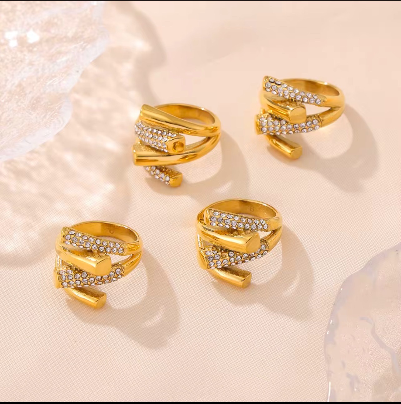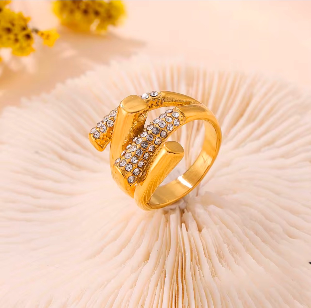 Inel placat cu aur,decorat cu cristale cehe,realizat din titan rezistent. Disponibil in marimile 6,7,8.