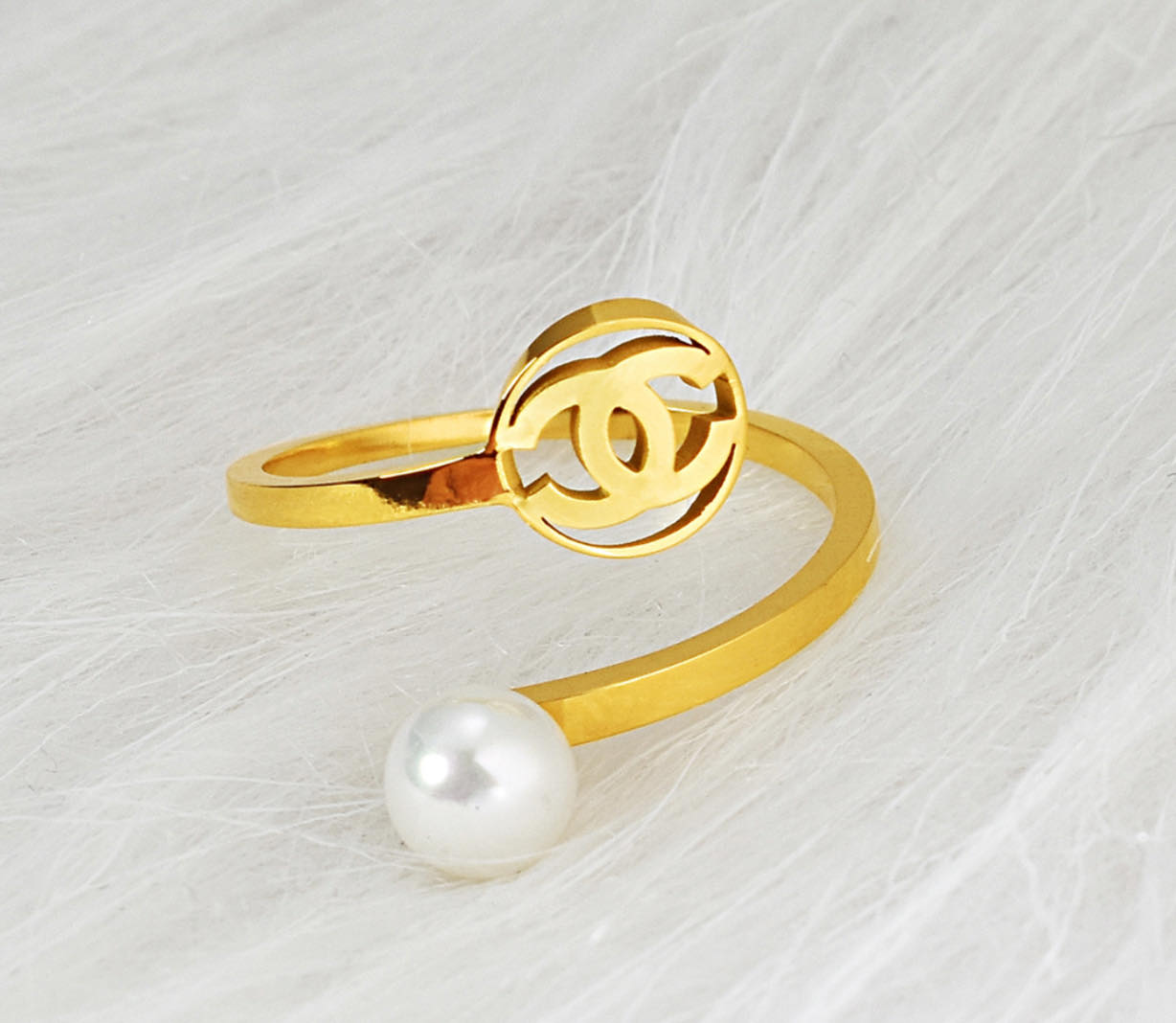 Acest inel de tip Chanel are o marime ajustabila si este realizat din titan placat cu aur de 18k.Designul sau include logoul iconic Chanel,plasat central,iar la un capat al inelului se afla o perla alba,adaugand un element sofisticat si elegant piesei.