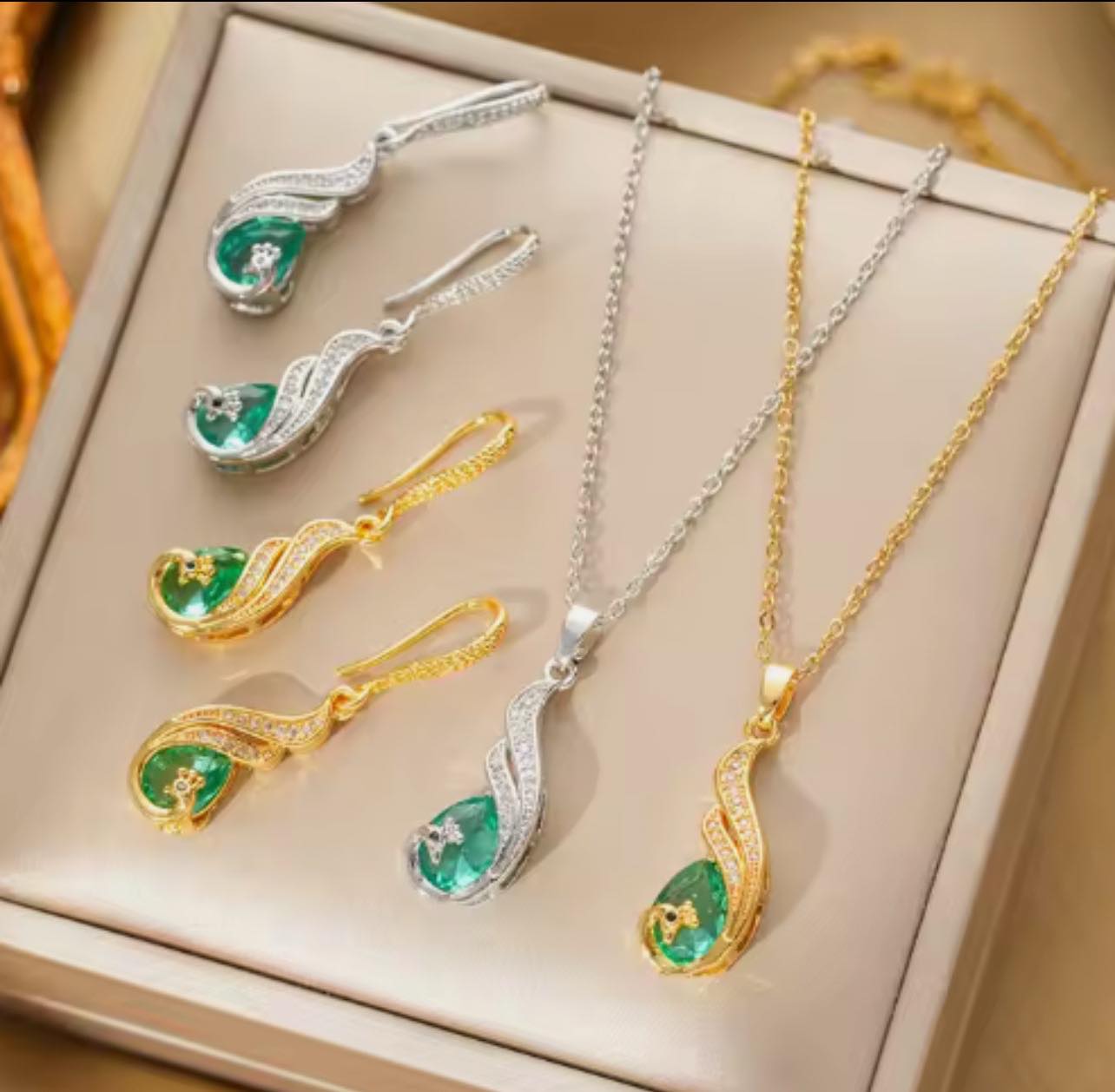 Set compus din colier si cercei aurii,cu design curbat si cristale verzi captivante.Ideal pentru un look sofisticat la evenimente speciale.
