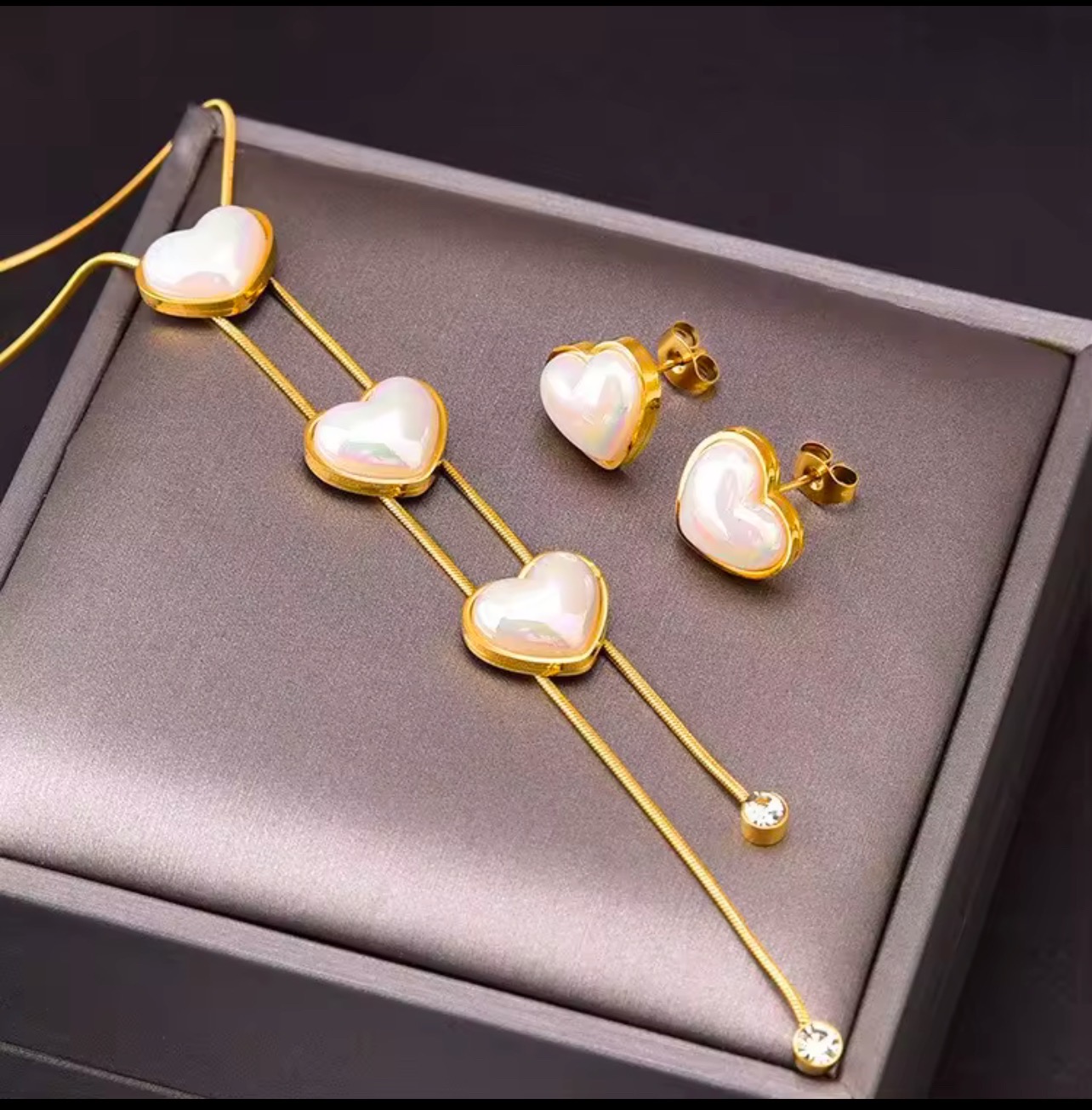 Set rafinat cu colier si cercei aurii,decorate cu inimioare si detalii perlate.Un accesoriu ce inspira romantism si eleganta.