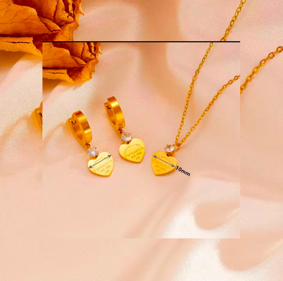 Set elegant din colier si cercei placati cu aur 18k,cu pandative in forma de inima si cristale stralucitoare.