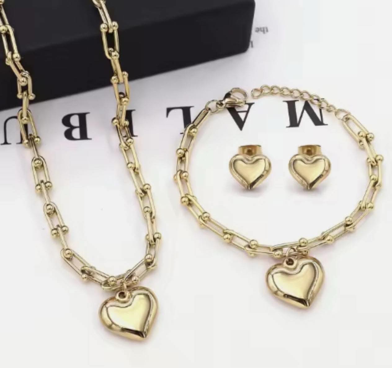 Set elegant cu colier,bratara si cercei,decorat cu pandative in forma de inima. Perfect pentru cadouri sau ocazii speciale.