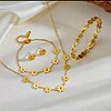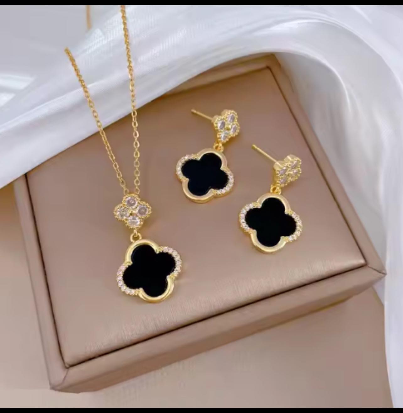 Set elegant compus din cercei si colier,cu pandativ in forma de floare,decorat cu onix negru si accente stralucitoare din zirconiu,placat cu aur.Ideal pentru tinute sofisticate.