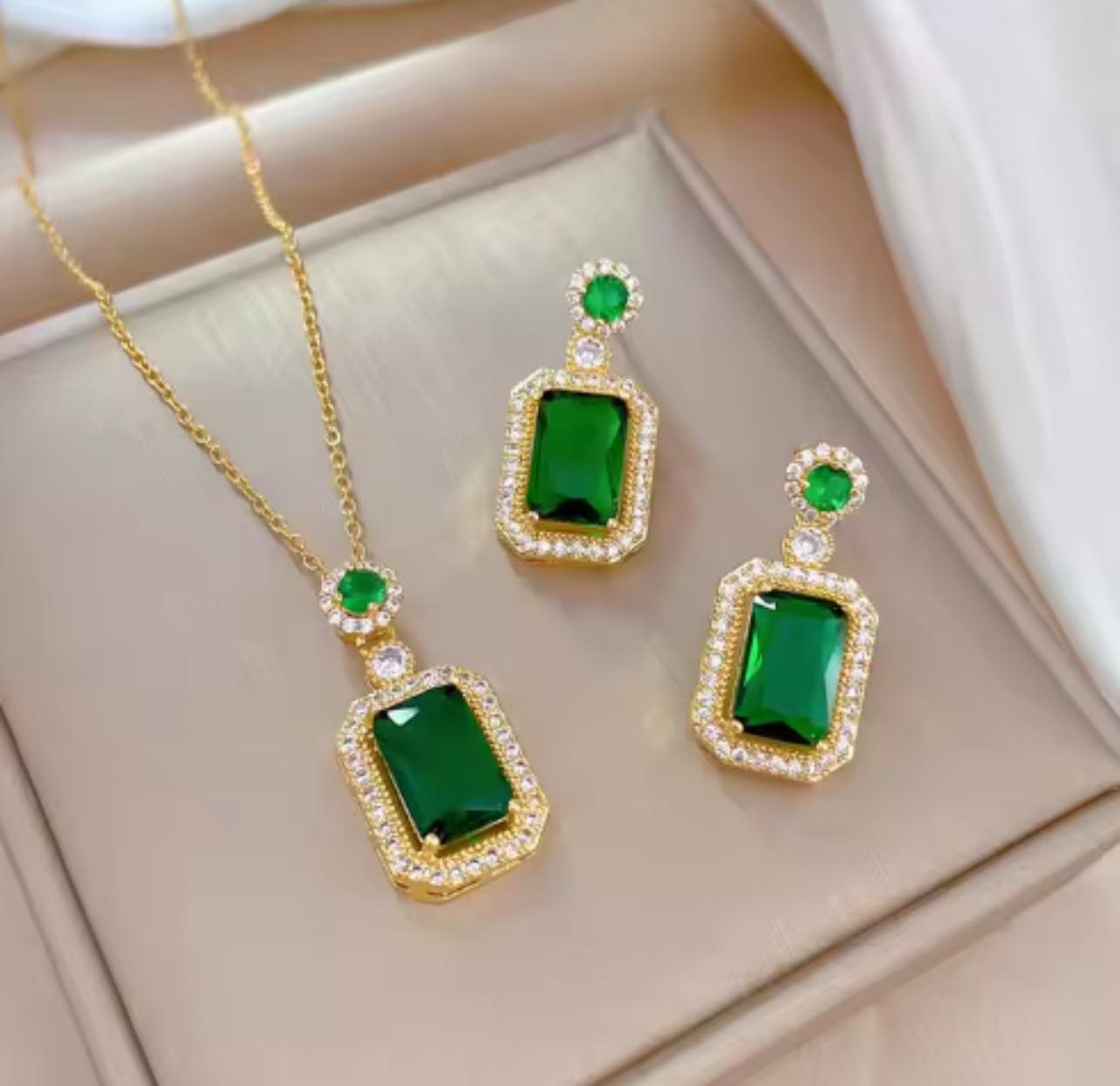 Set rafinat compus din cercei si colier,placat cu aur si decorat cu cristale verzi incadrate de zirconiu stralucitor.Perfect pentru ocazii speciale.