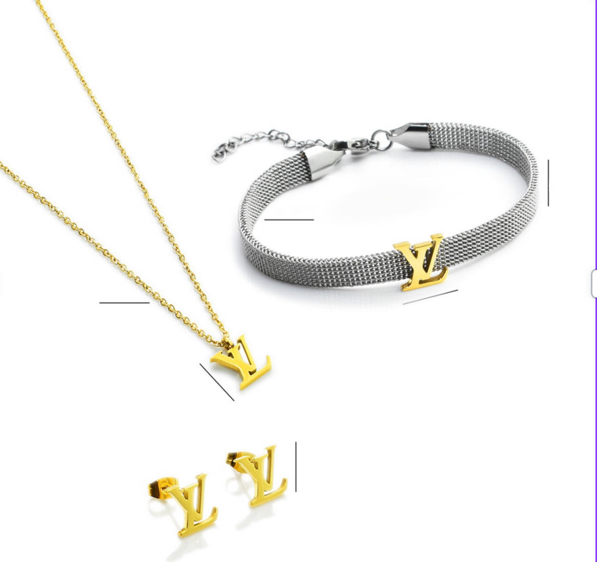 Setul de bijuterii tip Louis Vuitton,compus din cercei,lant cu pandativ si bratara din titan suflat cu aur de 18k,emana eleganta si rafinament.Designul distinctiv si durabilitatea materialelor reflecta stilul luxos si atemporal al brandului.